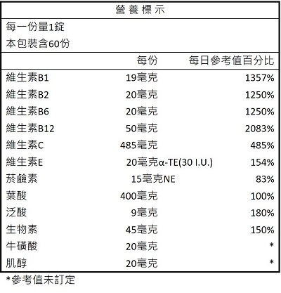 主成分:維生素C 97%(維生素C、玉米澱粉) 、乳糖、微結晶狀α-纖維素、維生素E 50%(醋酸dl-α-生育醇酯、蔗糖、辛烯基丁二酸鈉澱粉、玉米澱粉、水、矽鋁酸鈉)、維生素B6、維生素B1、維生素B2、牛磺酸、肌醇、菸鹼醯胺、硬脂酸鎂、本多酸鈣、葉酸、維生素B12、生物素
