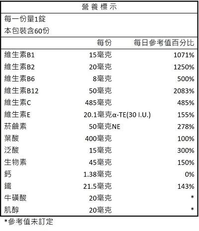1. 維生素B群、C、E、特別添加牛磺酸及肌醇